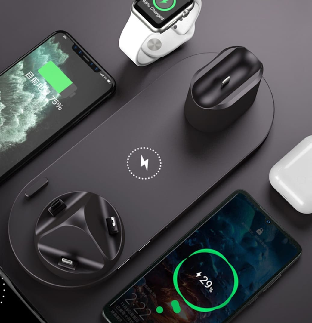 Charge your devices easily with this 6-in-1 wireless charging dock. Designed for iPhone, it allows you to charge multiple devices in one place.